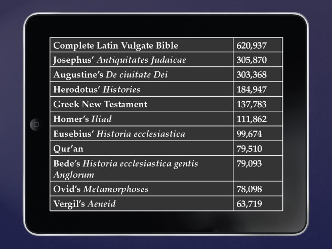 [8] Josephus’ Antiquitates Judaicae 305,870; Augustine’s De ciuitate Dei 303,368;[8] Herodotus’ Histories 184,947; the Greek New Testament 137,783; Josephus’ De bello Judaico 125,221; Homer’s Iliad 111,862; Eusebius’ Historia ecclesiastica 99,674; Homer’s Odyssey 87,185; the Qur’an 79,510; Bede’s Historia ecclesiastica gentis Anglorum 79,093; Ovid’s Metamorphoses 78,098; Vergil’s Aeneid 63,719; Juvenal’s Saturae, 26,564; and Horace’s Carmina 13,292.