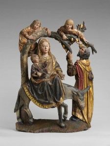The Miracle of the Palm Tree on the Flight to Egypt walnut sculpture, c. 1490–1510, based on an engraving by Martin Schongauer (c. 1476), from the Cathedral of Calahorra in La Rioja, Spain, now held by the Met Museum, NY (object; see the image below).
